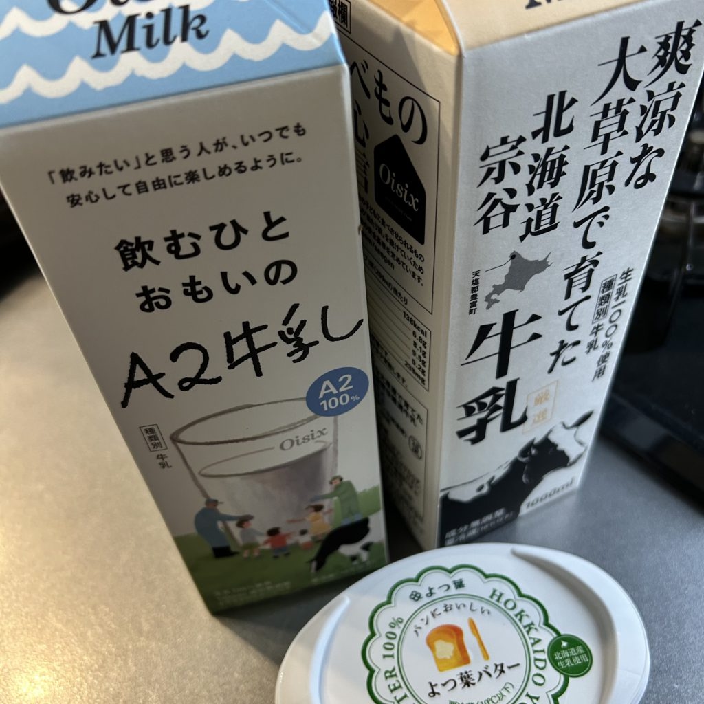 「A2牛乳」は、お腹に優しい牛乳だそうです。牛乳でお腹を下しやすい人におすすめとか。夫がお腹弱いのと、近所のスーパーでは売っておらず、普通に美味しいので、あれば買ってます。